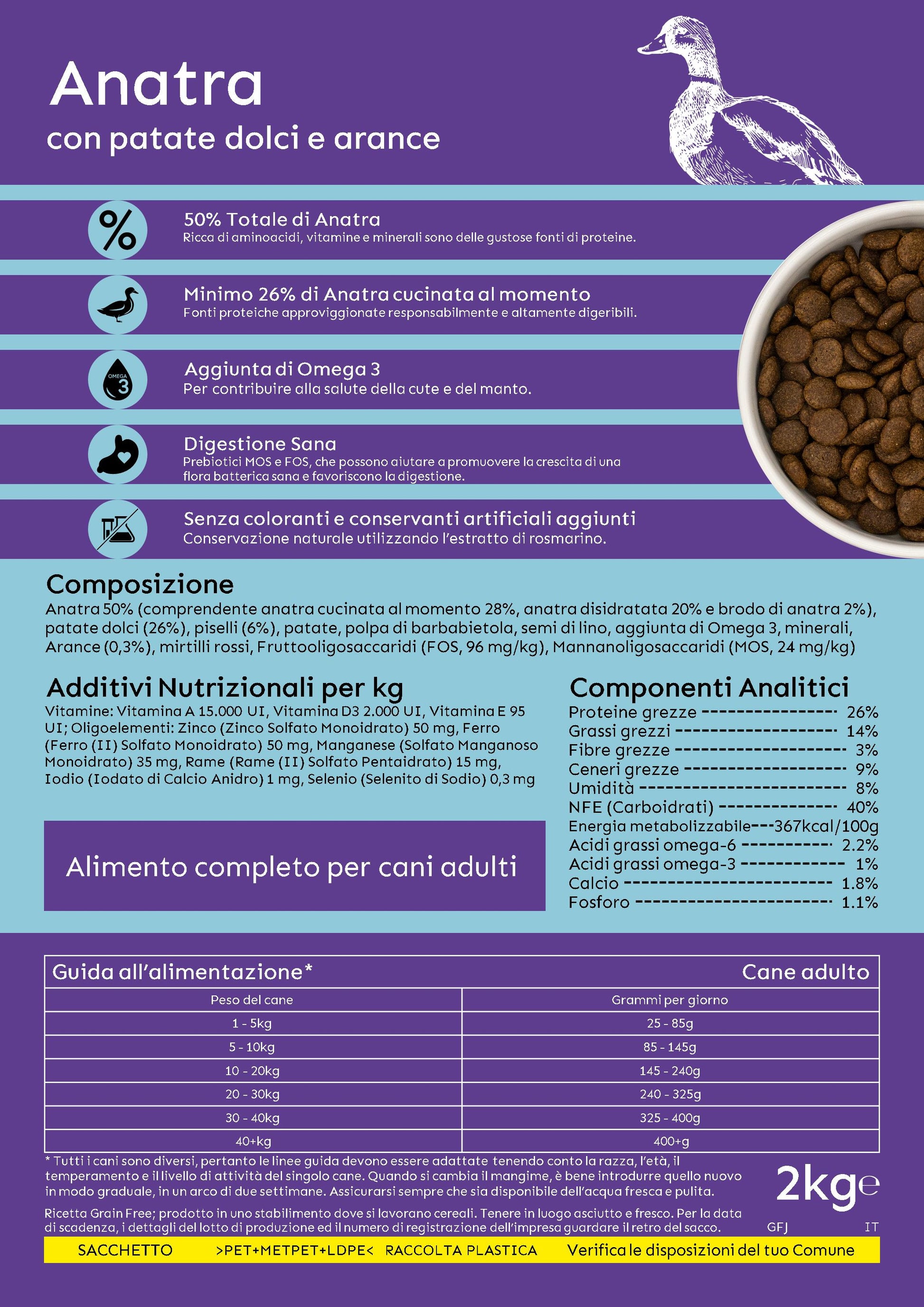 Ricetta dall'elevato contenuto di anatra (50%) e priva di derivati. L'anatra risulta molto leggera ed è quindi consigliata ai cani che hanno difficoltà digestive. L’aggiunta di arancia apporta vitamina C, a supporto del sistema immunitario. Ricco di Omega 6 e Omega 3. Senza cereali aggiunti e senza conservanti, aromi o coloranti artificiali.