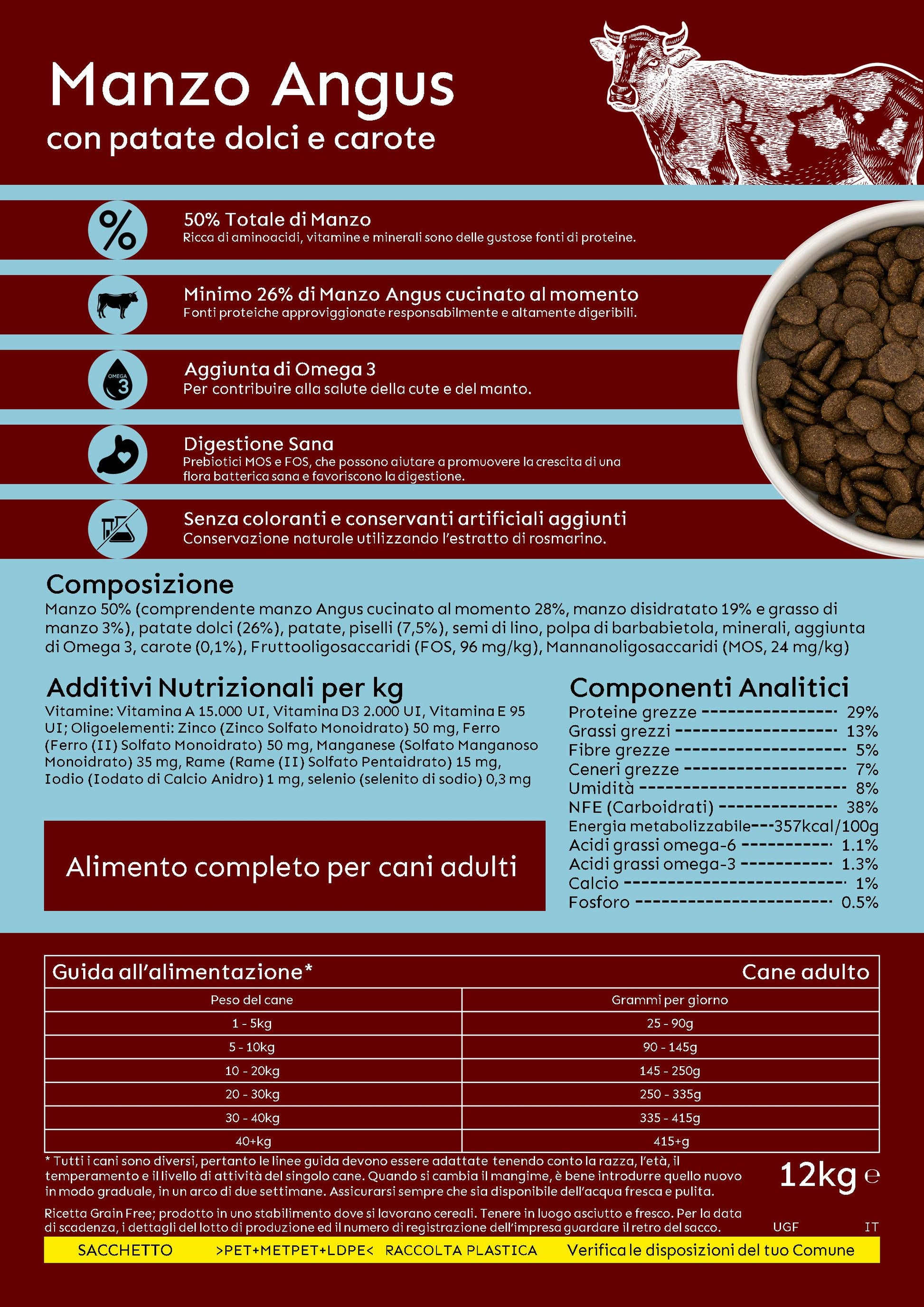 Ricetta dall'elevato apporto di manzo (50%) consigliata soprattutto nella stagione invernale per i cani che praticano attività sportive. L'aggiunta di carota rappresenta una fonte di vitamina A e aiuta a supportare la salute degli occhi e la vista. Ricco di Omega 6 & Omega 3. Senza cereali aggiunti e senza conservanti, aromi o coloranti artificiali.