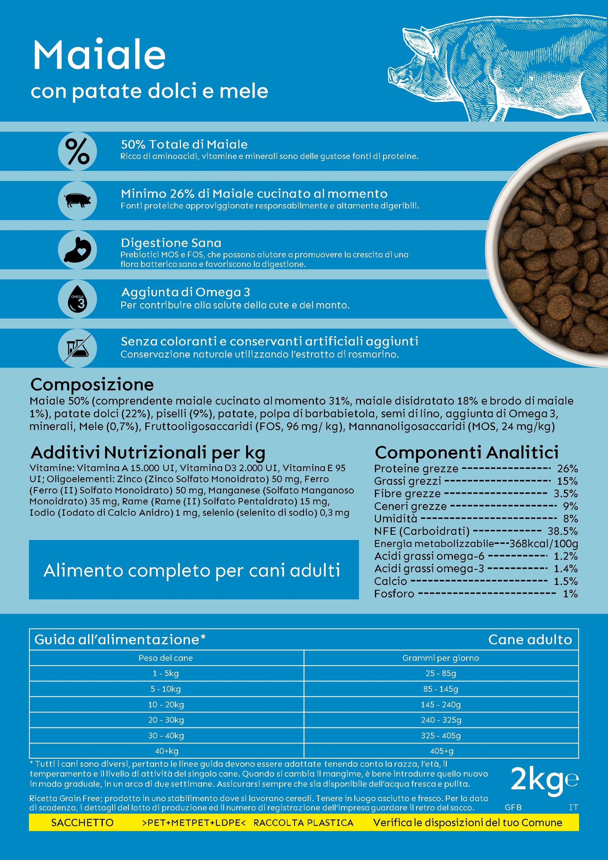 Ricetta ad alto contenuto di maiale (50%) che favorisce il riequilibrio dell'apparato gastrointestinale, consigliata soprattutto nelle mezze stagioni. Il maiale è considerato ipoallergenico e quindi ottimo nei casi di sensibilità ad altre proteine animali, o nei casi di dermatite. La mela apporta antiossidanti come i flavonoidi, che aiutano a proteggere le cellule dai danni causati dai radicali liberi. Ricco di Omega 3 e Omega 6. Senza cereali aggiunti e senza conservanti, aromi o coloranti artificiali.