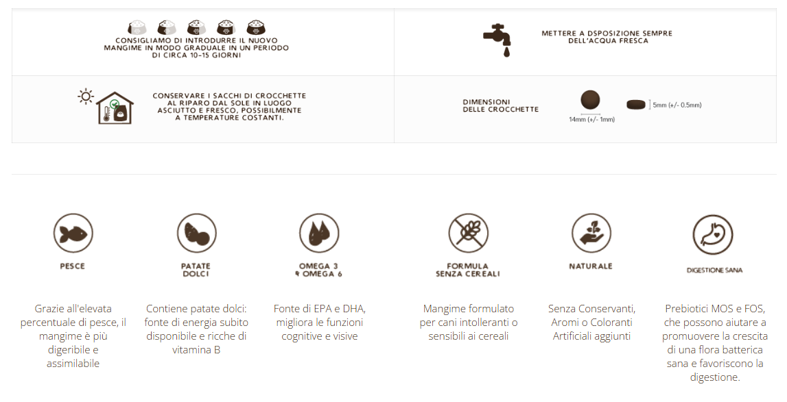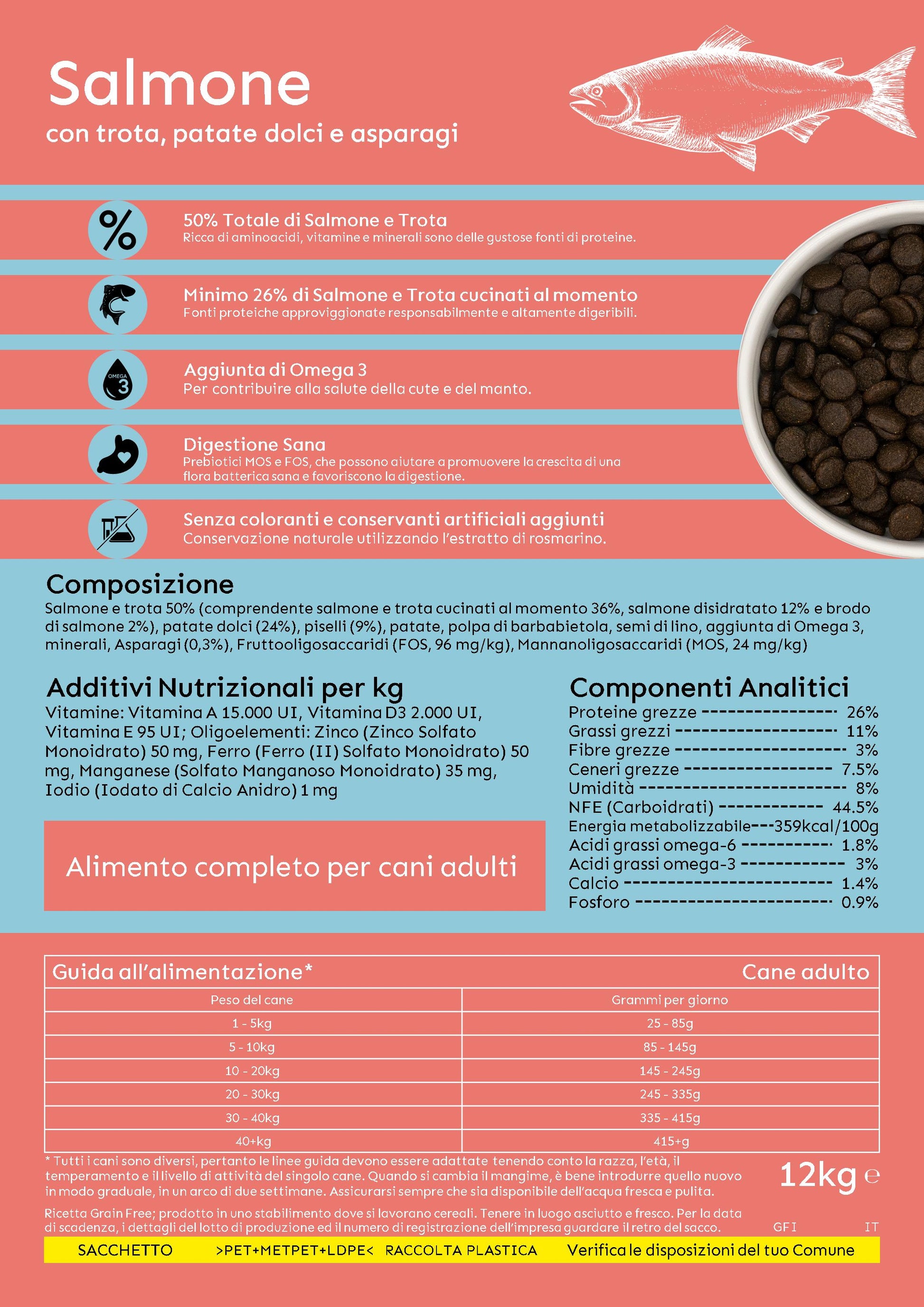 Ricetta dall'elevato contenuto di salmone e trota (50%), grazie ai nutrienti che contiene ha effetto lenitivo sulla pelle e rinforza la crescita del bulbo. L’aggiunta di asparago apporta vitamine e acido folico, e aiuta a mantenere pulite le vie urinarie. Ricco di Omega 6 e Omega 3. Senza cereali aggiunti e senza conservanti, aromi o coloranti artificiali.