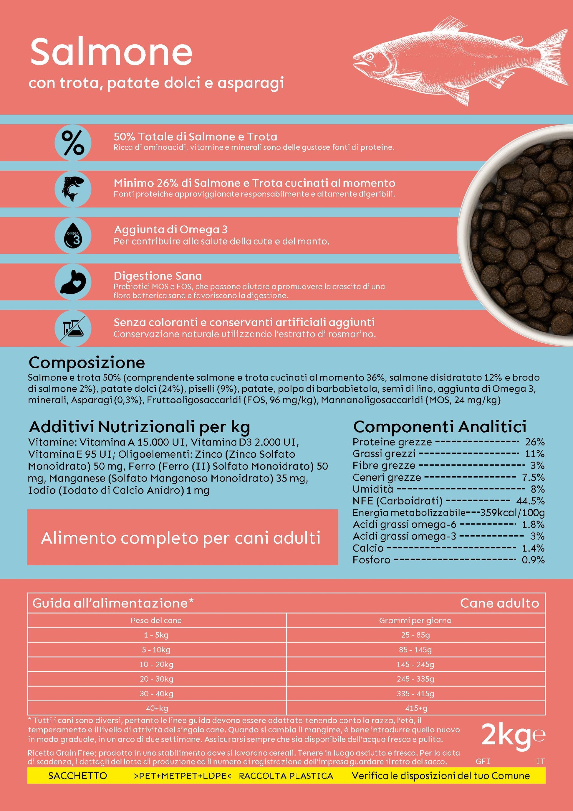 Ricetta dall'elevato contenuto di salmone e trota (50%), grazie ai nutrienti che contiene ha effetto lenitivo sulla pelle e rinforza la crescita del bulbo. L’aggiunta di asparago apporta vitamine e acido folico, e aiuta a mantenere pulite le vie urinarie. Ricco di Omega 6 e Omega 3. Senza cereali aggiunti e senza conservanti, aromi o coloranti artificiali.