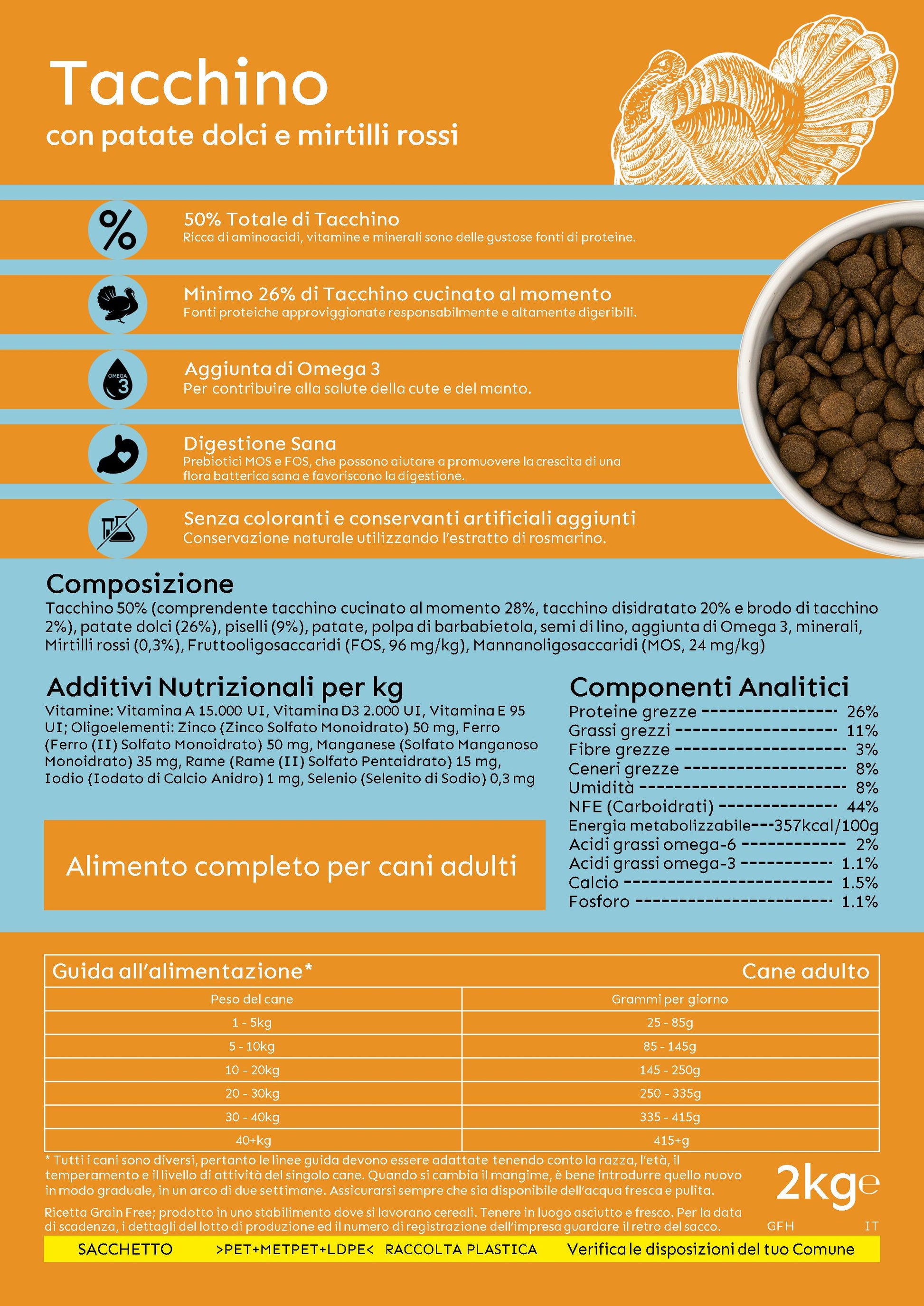Ricetta ricca di tacchino (50%) ideale per i cani che preferiscono le carni bianche e consigliata nella stagione estiva. Selezioniamo la materia prima da allevamenti a terra per mantenere un alto standard di qualità. La presenza del mirtillo rappresenta una fonte di vitamine e di fibre alimentari. Ricco di Omega 6 & Omega 3. Senza cereali aggiunti e senza conservanti, aromi o coloranti artificiali.