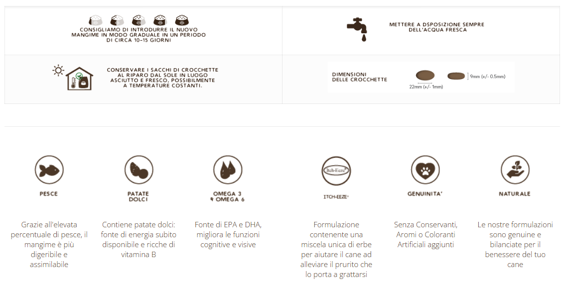 Ricetta ricca di Omega 3 e Omega 6, contiene inoltre Biotina e Zinco per migliorare e mantenere la salute del pelo e della pelle del cane. Non contiene cereali e il buon apporto proteico fornisce le corrette quantità di Vitamine e Minerali per rinforzare il sistema immunitario. ITCH-EEZE® è un estratto naturale di piante officinali che allevia le dermatosi, lenisce il prurito e mantiene puliti pelle e pelo; migliora anche le funzioni gastrointestinali.