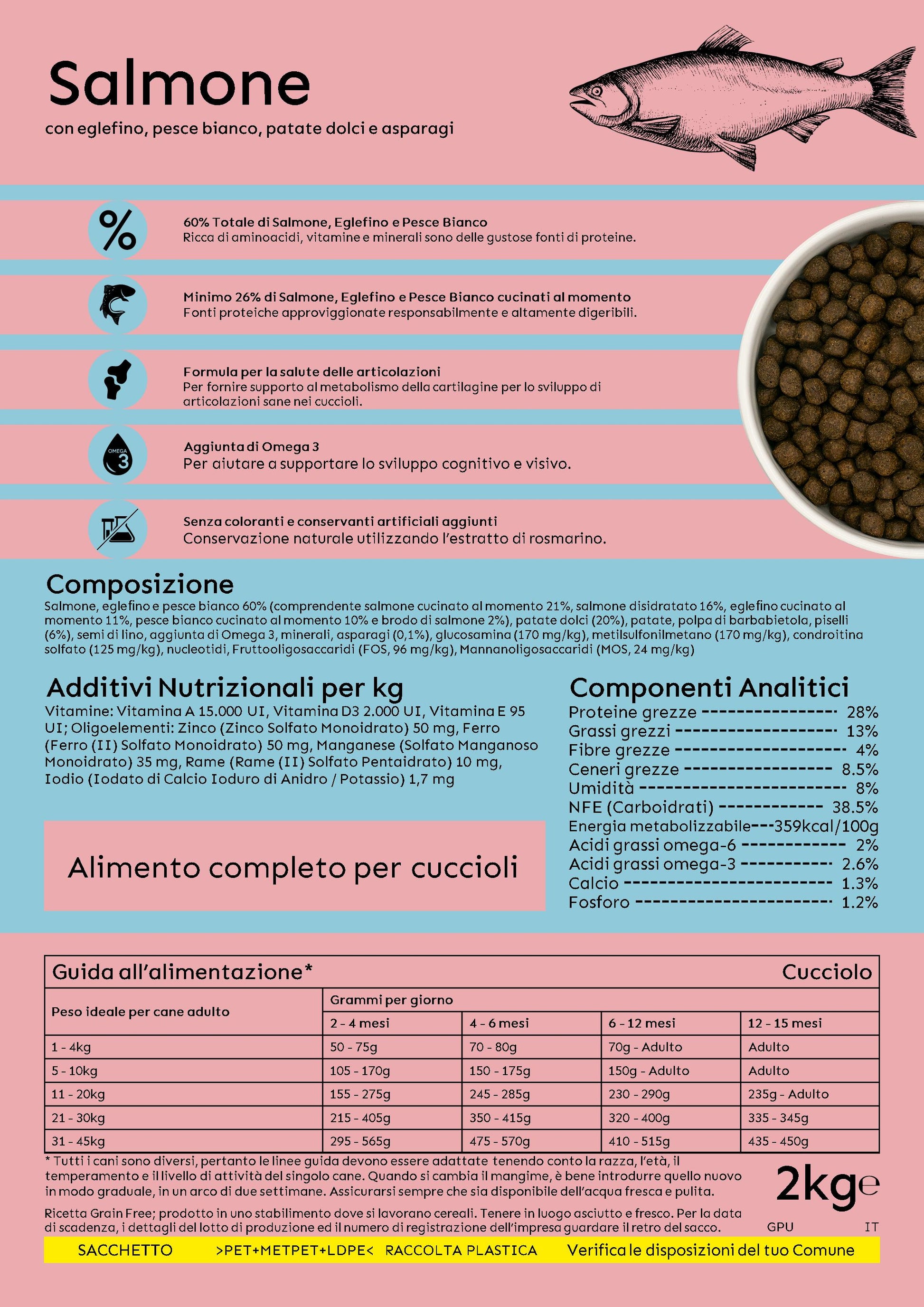 Ricetta con il minimo 26% di Salmone, Eglefino e Pesce Bianco, Fonti proteiche e altamente digeribili. \n60% totale di Salmone, Eglefino e Pesce Bianco. Ricchi di aminoacidi, il salmone, l’eglefino e il pesce bianco sono delle deliziose fonti di proteine. Formula per la salute delle articolazioni: per fornire supporto al metabolismo della cartilagine per lo sviluppo di articolazioni sane nei cuccioli. Aggiunta di Omega 3 per aiutare a supportare lo sviluppo cognitivo e visivo. Con l'aggiunta di patate dolci: un' eccellente alternativa ai cereali, le patate dolci sono carboidrati complessi ricchi di vitamine del gruppo B. Senza coloranti e conservanti artificiali aggiunti Conservazione naturale utilizzando l'estratto di rosmarino.