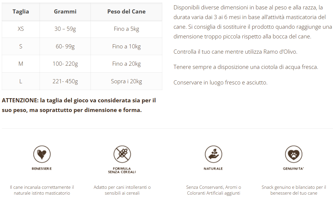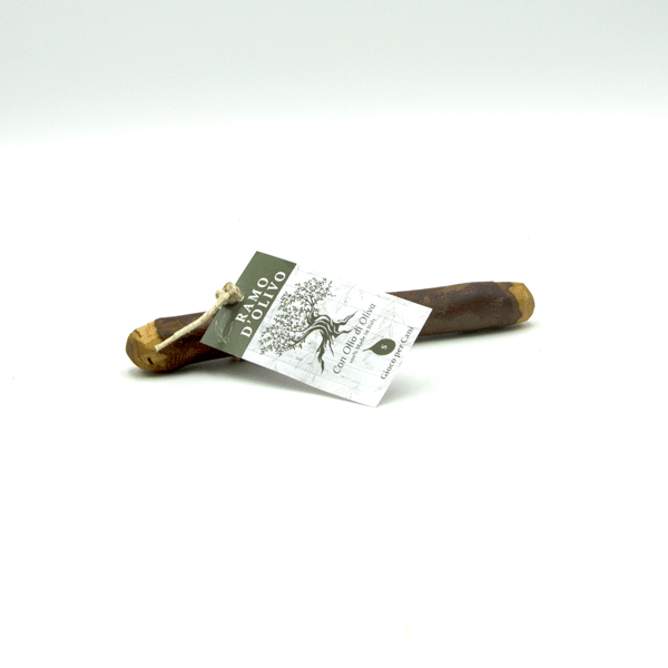 Ramo d’Olivo è un Masticativo 100% Naturale realizzato dalla Nostra Bottega Artigianale. Rami d’Olivo ottenuti da Piante di Olivo lombarde, vengono raccolte direttamente dai nostri Maestri Falegnami, selezionati per forma e qualità al fine di realizzare manufatti di pregio. Dopo la lavorazione, rigorosamente manuale, vengono intinte in Olio di Oliva Italiano che conferisce un particolare profumo Naturale; infine viene essiccato e lavorato a mano. E' privo di componenti artificiali, inoltre contribuisce all'igiene dentale poiché stimola la salivazione e favorisce la rimozione della placca dentaria attraverso l'azione meccanica. Serve per incanalare l'istinto masticatorio svolgendo un’azione calmante nei i Cani.